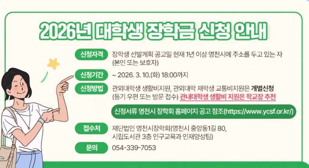 * Application Documents: Refer to the announcement on the Yeongcheon City Scholarship Foundation website (https://www.ycsf.or.kr/)