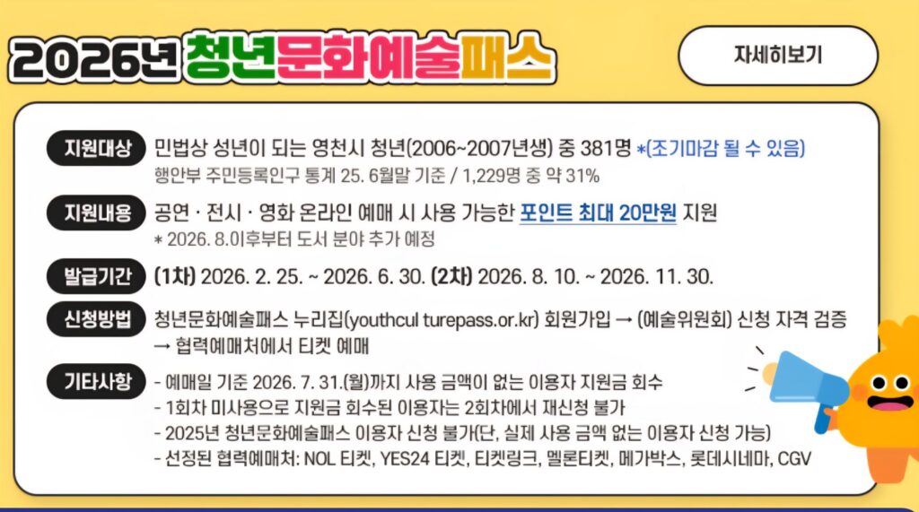 * Register on the Youth Culture & Arts Pass website (youthculturepass.or.kr) → Eligibility verification (Arts Council Korea) → Book tickets through partner booking platforms