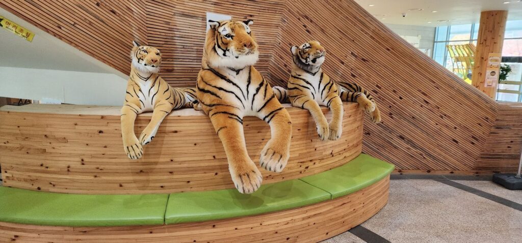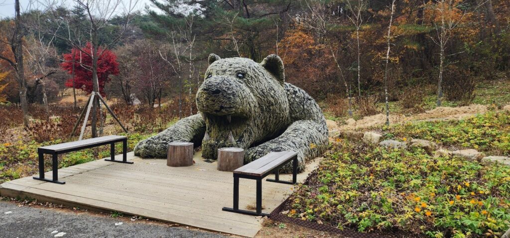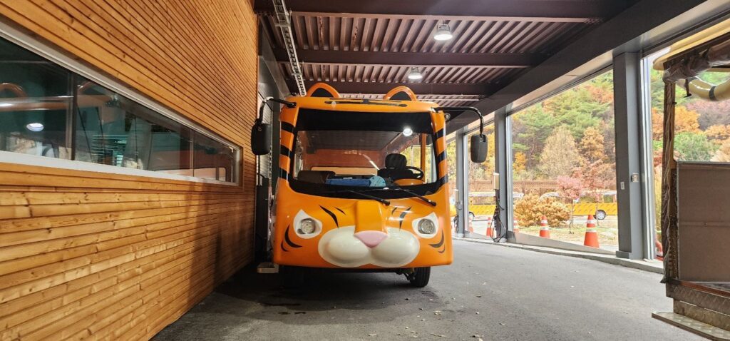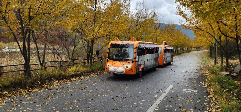 Tour sites where we visit is three places. the one is Baekdudaegan National Arboretum to see tigers. on the way to tiger zone uses car is designed by tiger pattern and walk down to the meeting point.