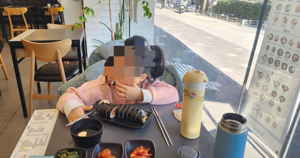 Thankfully, the university hospital bill was settled and necessary documents were collected before proceeding to the external clinic. All tasks were completed in a rush before lunchtime. This was accomplished, and Gimbap was enjoyed near the hospital, followed by an order of Budae jjigae.