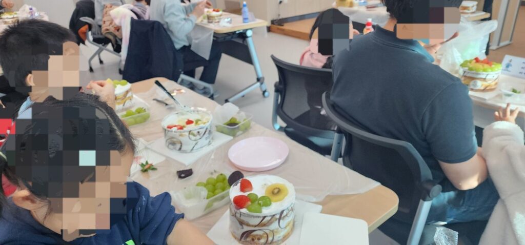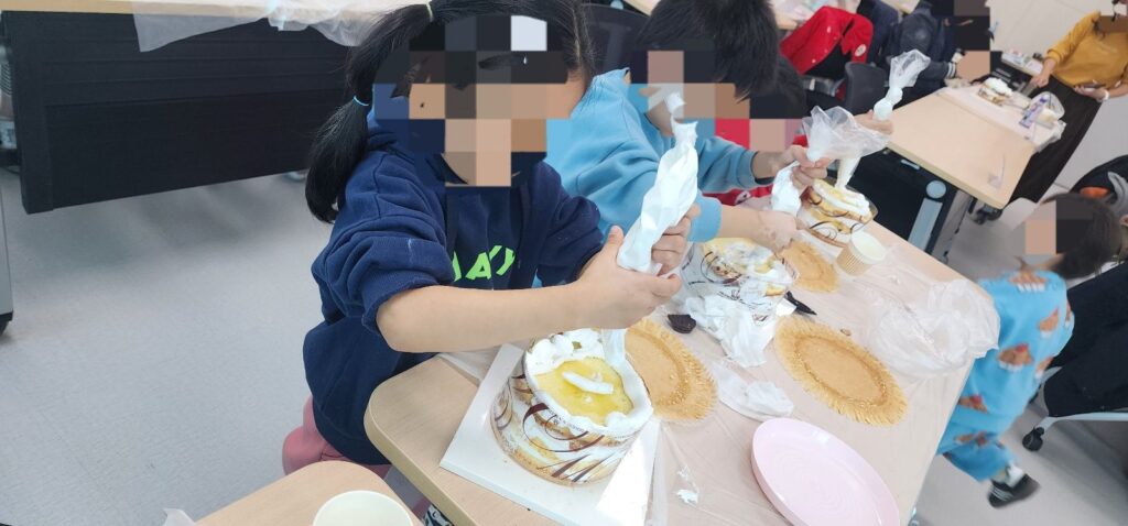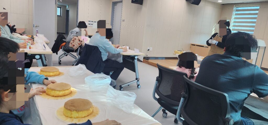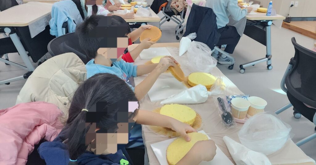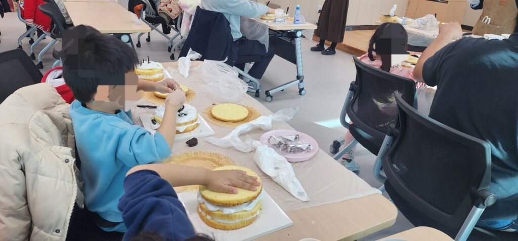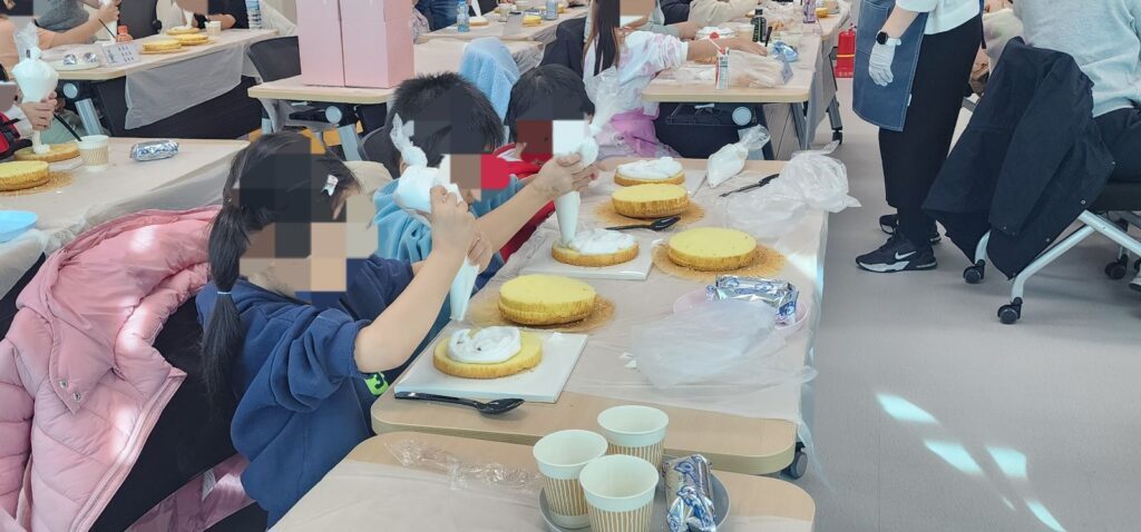 The class commenced at 10:00 AM, but many families did not attend, possibly due to the change in location. Two teachers facilitate the class, collaboratively guiding us through the cake-making process.