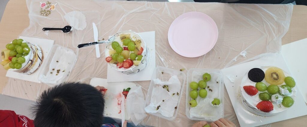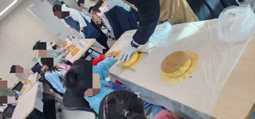 For safety, the teachers handled the slicing of the bread into three layers, while the children participated by placing their hands on the bread, feeling involved in the cake’s creation.
