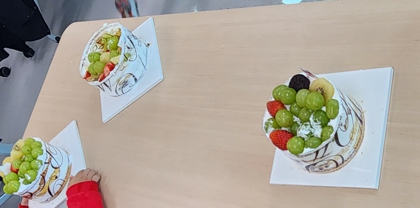 For safety, the teachers handled the slicing of the bread into three layers, while the children participated by placing their hands on the bread, feeling involved in the cake’s creation.