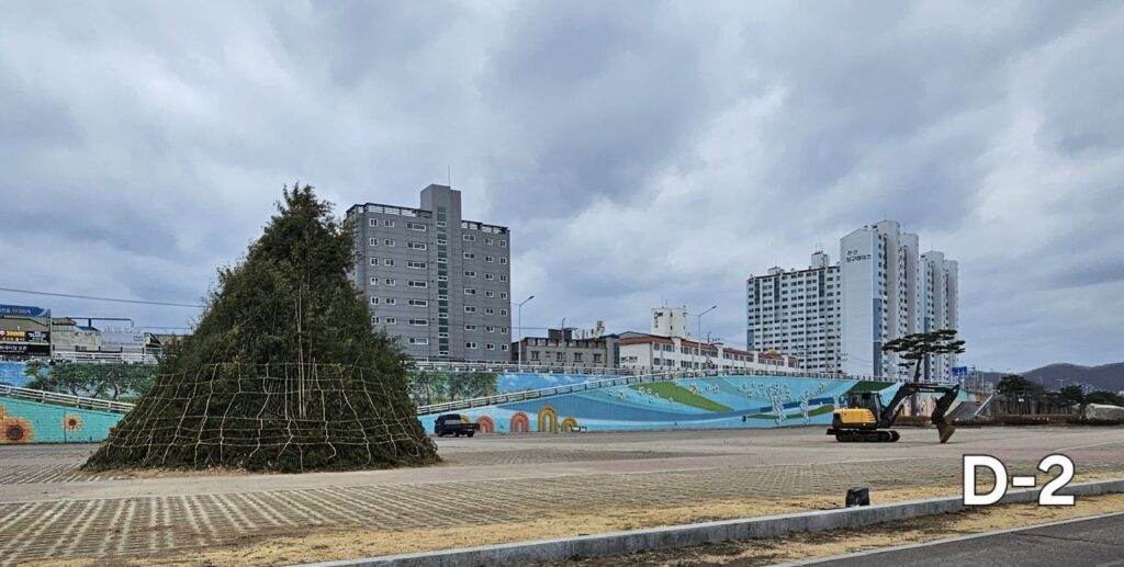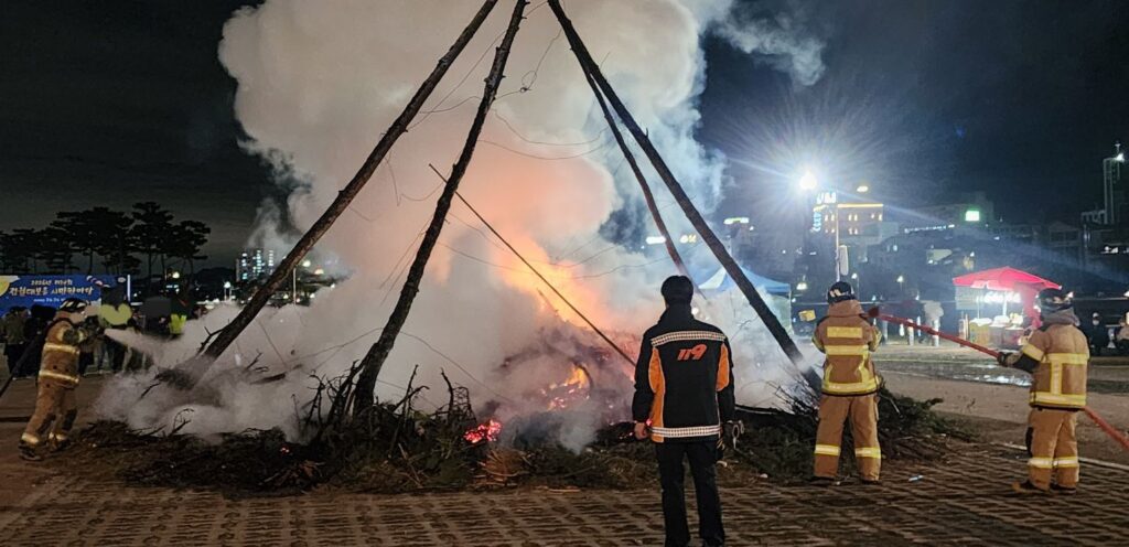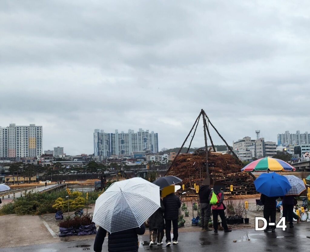 This annual event marks the Jeongwol Daeboreum, which is an evening celebration. I had the opportunity to see set up the burning event when I was near the riverside park. Interestingly, the weather leading up to the festival included rain, which thoroughly soaked all the trees intended for the burning. Efforts were made to ignite a large pile of trees; pieces of burnable wood were stacked into a very tall cone shape, but they had become wet due to the rain in the preceding days.